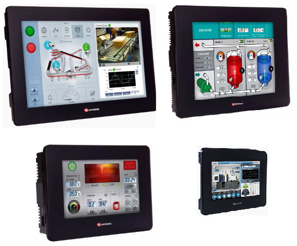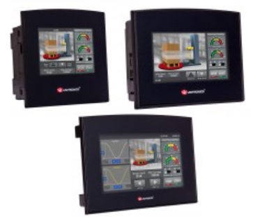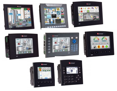 Inbyggd CPU och I/O:s i flera varianter. Kan expanderas på DIN-skena. Skärmar: 5″, 7″ och 10″. - UniStream med virtuell HMI: