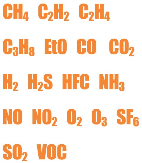 Ammoniak Acetylen Butan Koldioxid Kolmonoxid Klor Etanol Eten Etylenoxid Halokarboner Väte Vätesulfid Metan Kväveoxid Kvävedioxid Lustgas Syre Ozon Propan Svaveldioxid Svavelhexafluorid Flyktig organisk förening