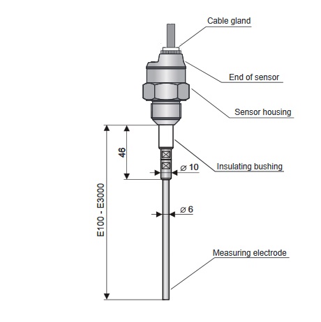 Oisolerad stavelektrod – för nivåmätning av ej elektriskt ledande vätskor (vegetabilisk olja, diesel, bensin) och fasta material (mjöl, sand, cement, plastgranulat, etc). max. längd 3 m.